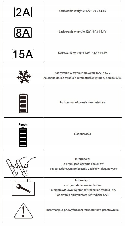 - Струм зарядки: 2 A / 8 A / 15 A (12 В)