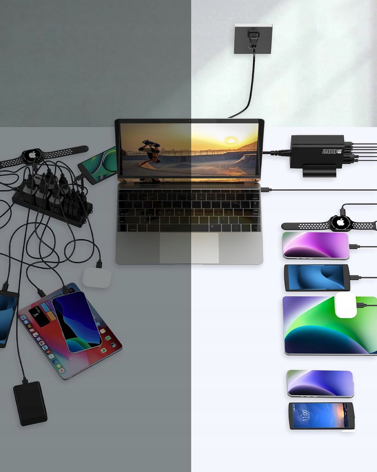 - Загальна потужність 200 Вт забезпечує живлення для смартфонів, планшетів і ноутбуків