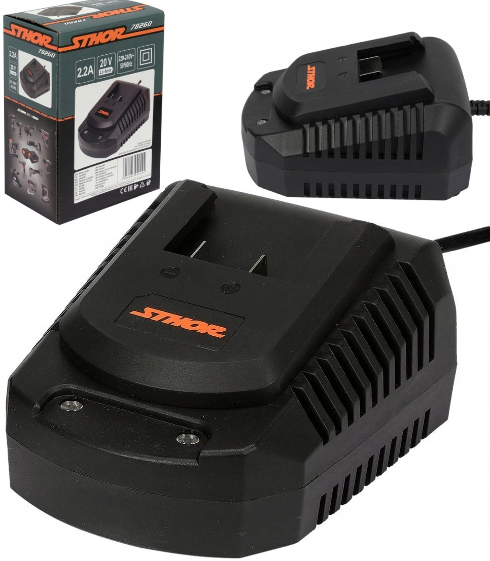 Зарядний пристрій для акумулятора Sthor 20 В. Працює при струмі 2,2 А. Заряджає акумулятор ємністю 2 Ач приблизно за 60 хв., 4 Ач - 120 хв.