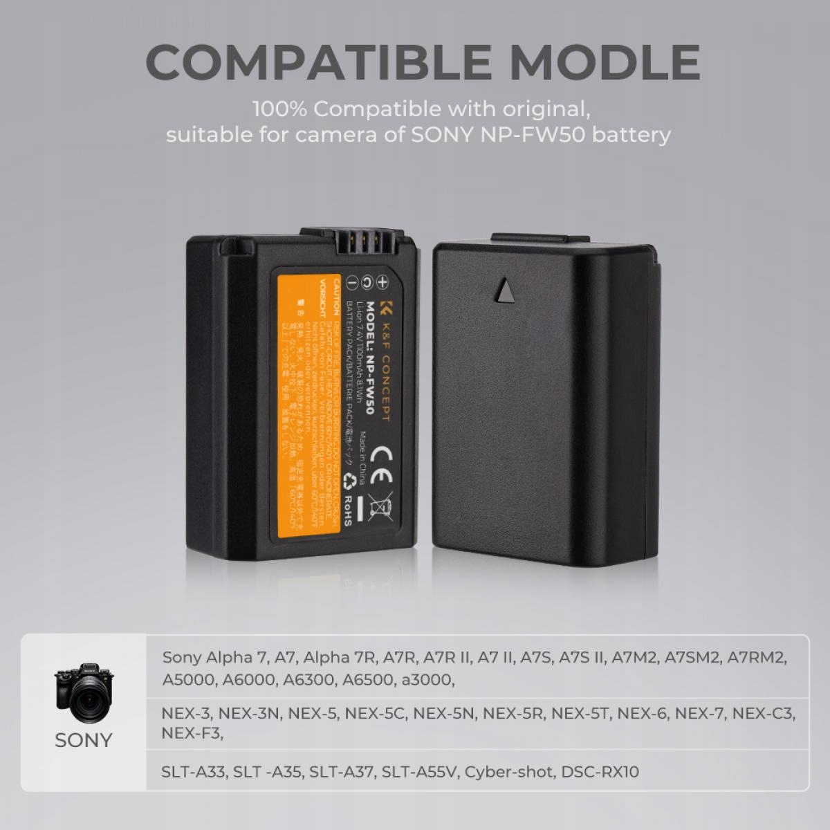 - Sony Alpha 7, A7, Alpha 7R, A7R, A7R II, A7 II, A7S, A7S II, A7M2 , A7SM2, A7RM2, A5000, A6000, A6300, A6500, a3000, NEX-3, NEX-3N, NEX-5, NEX-5C, NEX-5N, NEX-5R, NEX-5T, NEX -6, NEX-7 , NEX-C3, NEX-F3, SLT-A33, SLT-A35, SLT-A37, SLT-A55V, Cyber-shot, DSC-RX10