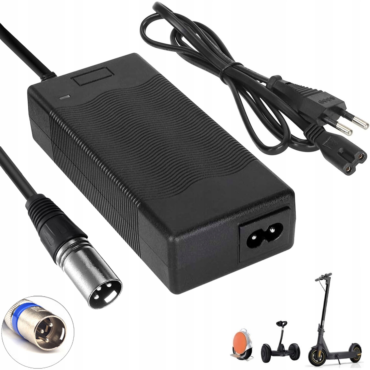 Зарядний пристрій 42V 2A Технічні дані: Вхід: AC100-240V, 50/60 Гц, вихід: 42V 2A; Заряджання електричного велосипеда, електричного скутера, електричного інвалідного візка та іншого літієвого обладнання 36 В, примітка: він не може бути використаний для акумуляторів інших напруг та кислотних батарей