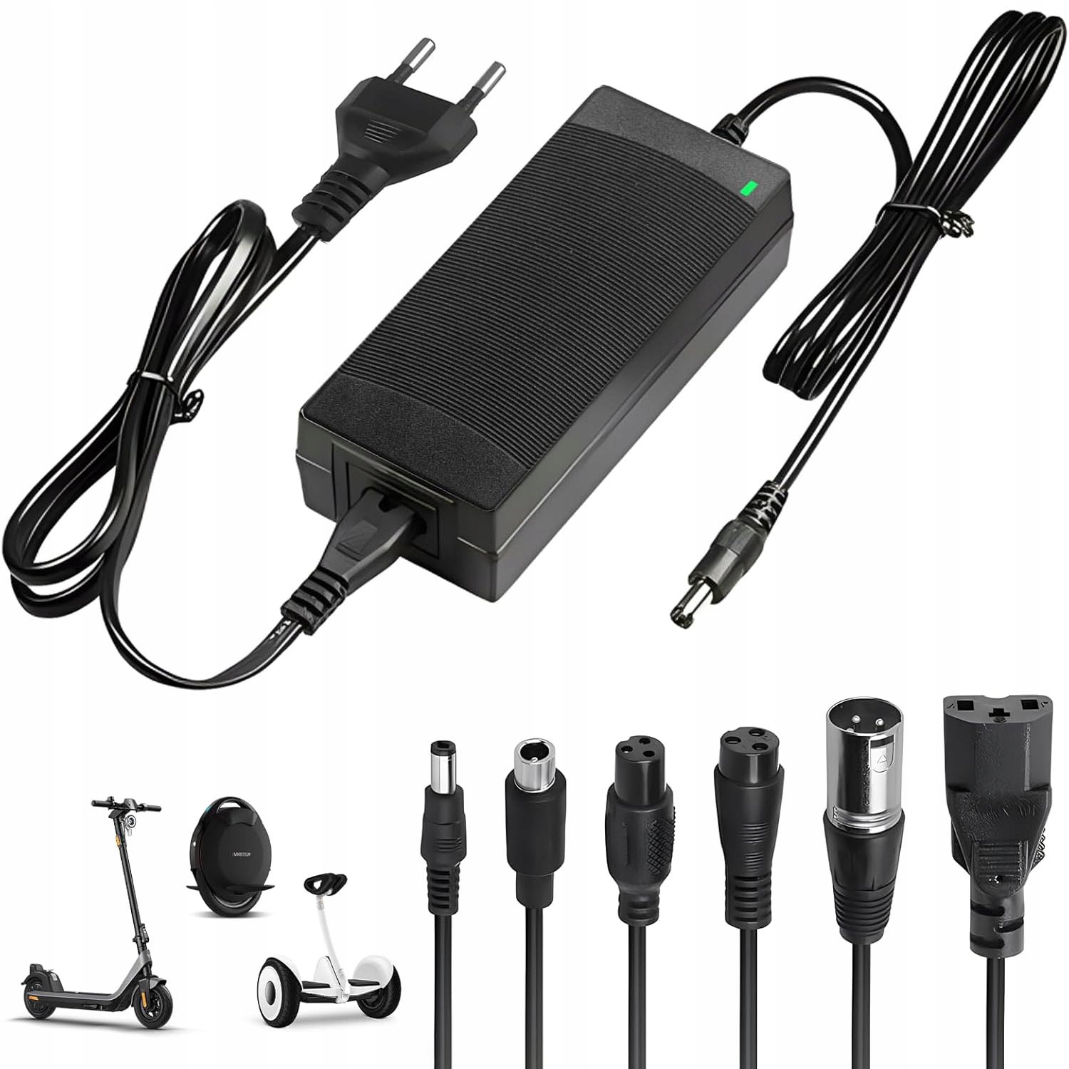Цей зарядний пристрій для електричного скутера оснащено повним набором із 6 змінних наконечників (зокрема штифтові, XLR, авіаційні 9 мм/12 мм, DC5,5). Це робить його універсальним зарядним пристроєм для багатьох моделей. Ви уникнете проблем з приміркою! Пам’ятайте: перед покупкою обов’язково перевірте сумісність штекера з вашим пристроєм, щоб переконатися, що він ідеально підходить.