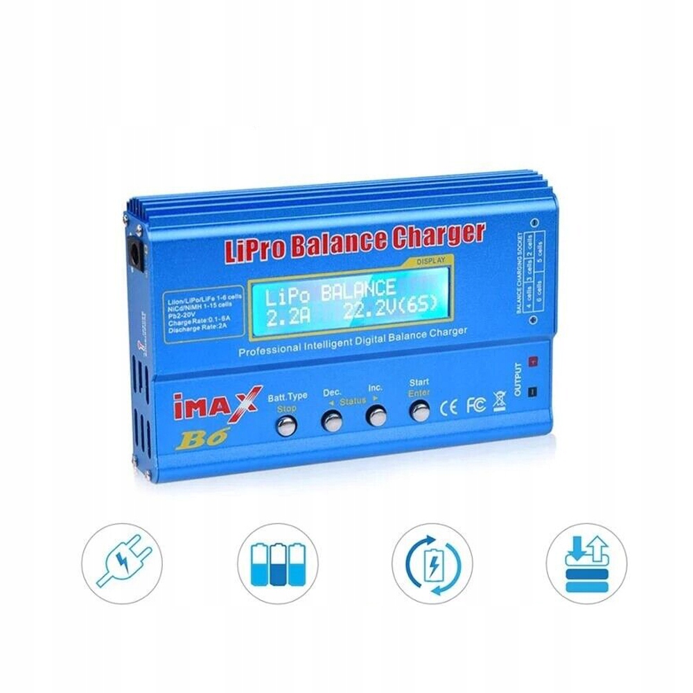 🔋 Зарядний пристрій iMax B6 містить незалежний балансир літієвої батареї, який може контролювати та балансувати будь-яку батарею. Він має функції швидкого зберігання та заряджання, зберігання та завантаження даних, а також функції циклічного заряджання та розряджання.