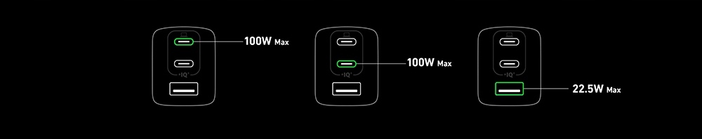 Завдяки 2 портам USB-C і одному порту USB-A ви можете одночасно заряджати телефон, ноутбук і навушники одним зарядним пристроєм. Підключіть один пристрій, щоб зарядити до 100 Вт.