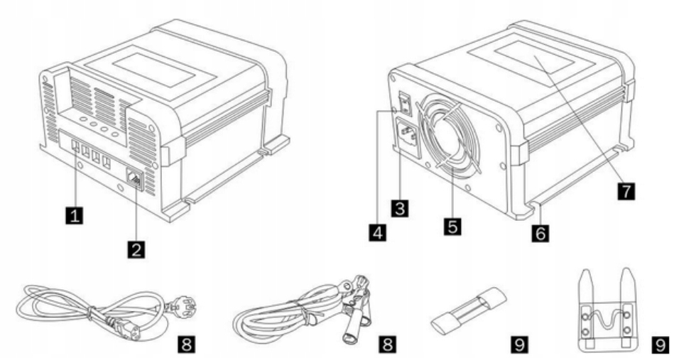 - Кабелі живлення: 230 В змінного струму + кабель із затискачами типу «крокодил» для акумулятор