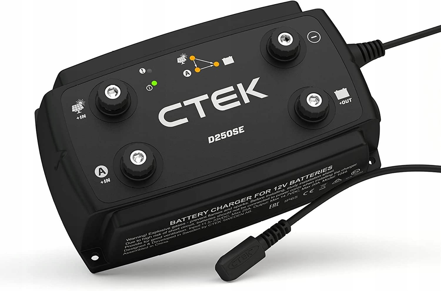 Зарядний пристрій D250SE — це повністю автоматичний 5-ступінчастий зарядний пристрій 12 В постійного/постійного струму, що живиться від генератора змінного струму автомобіля або сонячної панелі, який забезпечує зарядний струм до 20 А для будь-якої свинцево-кислотної або літієвої мережі 12 В акумулятор ємністю від 40 до 300 Ач.