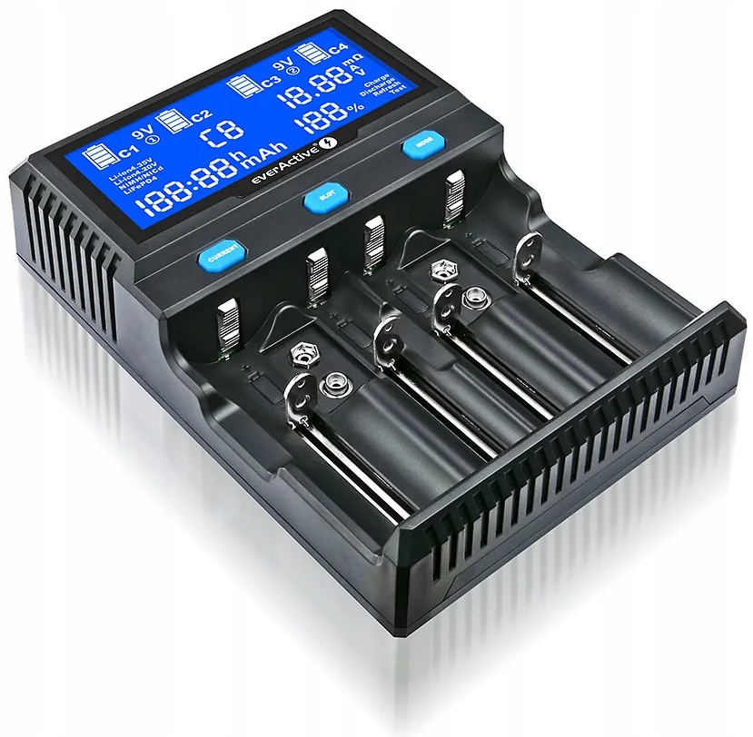 ✅ регульований струм заряджання для літієвих елементів: 4x 0,2 A/0,5 A/0,8 A/1 A/1,5 A або 2x 2 A (лише для каналів 1 і 4), для Ni-MH ми можемо вибрати з наступного заряду струми: 4x 0,2A /0,5A/0,8A/1A, для акумуляторів 6F22/9V струми зарядки 60mA або 120mA,