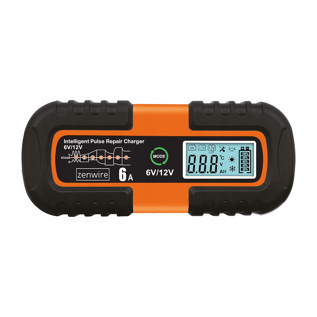 Зарядний пристрій Zenwire JMD-6S — це інтуїтивно зрозумілий і сучасний, простий у використанні пристрій, який дозволяє швидко, безпечно та повністю контрольовано заряджати акумулятори в 6 В і 12 В 6 А транспортних засобів, ця потужність дозволяє заряджати акумулятори в більшості легкових автомобілів, вантажівок, мотоциклів, човнів, навантажувачів, газонокосарок, велосипедів, іграшок, сигналізації та багатьох інших. Зарядний пристрій має інтелектуальну функцію відновлення акумулятора та РК-дисплей. Літній і зимовий режими дозволяють використовувати в складних умовах. У комплект входить зарядний пристрій, клеми для акумулятора, вбудований кабель живлення та інструкція користувача.