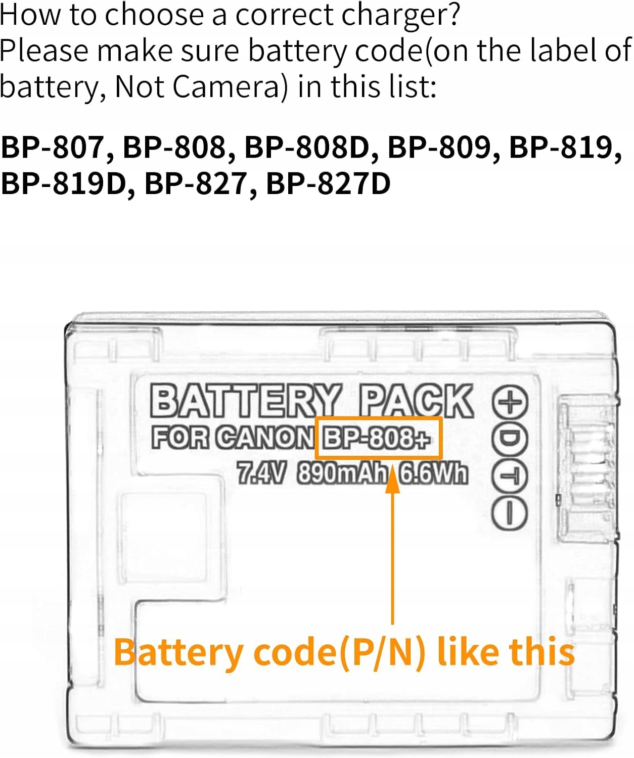 Як вибрати? Переконайтеся, що модель вашої батареї (на ярлику батареї, а не камери) є в цьому списку: BP-807, BP-808, BP-808D, BP-809, BP-819, BP-819D, BP-827, BP-827D. Canon FS100, FS200, FS300, LEGRIA HF G10, LEGRIA HF G25