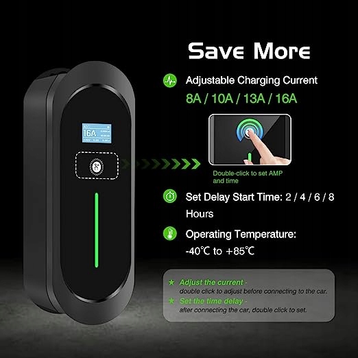 Відрегулюйте потужність (8A / 10A / 13A / 16A) - двічі клацніть, щоб налаштувати перед підключенням до автомобіля. * Встановити час затримки - після підключення автомобіля двічі клацніть на налаштування. Зарядний пристрій автоматично припиняє живлення, коли акумулятор повний.