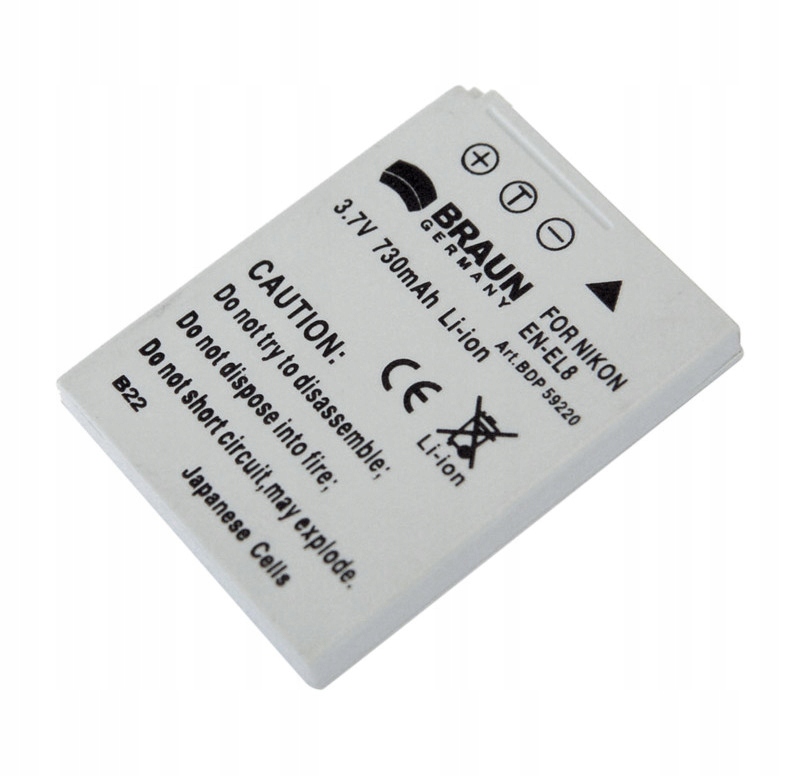 Літій-іонний акумулятор Braun BDP-NEL8 (D41, NIKON EN-EL8 - 3,7 В/730 мАг) для цифрових камер NIKON Coolpix P1, P2, S1, S2, S3, S5, S6, S7, S7c, S9, S50c, S51, S51c, S52, S52c. Ця батарея постачається частково зарядженою. Рекомендується зарядити акумулятор перед використанням. Повну ємність акумулятора можна досягти лише після приблизно 4-5 циклів заряджання.