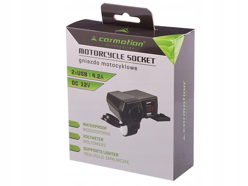 Зарядний пристрій для мотоцикла 2x USB 4.2A з вольтметром і євророзеткою для прикурювача