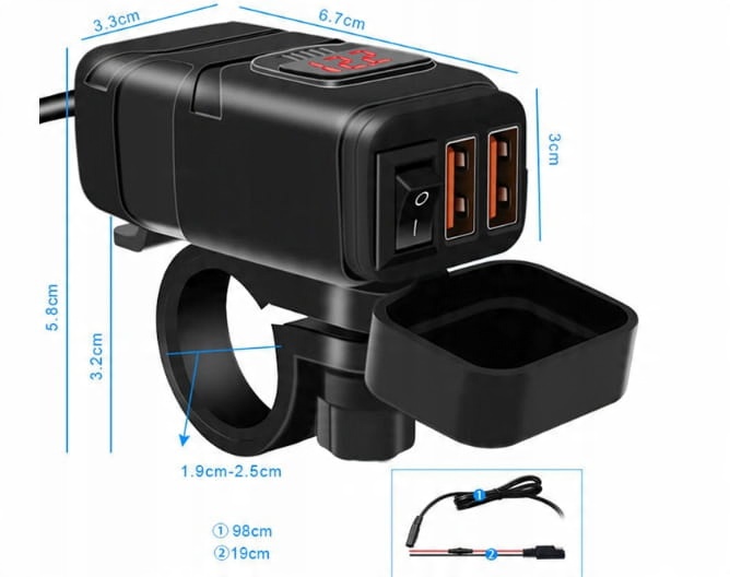 Зарядний пристрій USB. Функція швидкої зарядки зі змінною напругою QC 3.0 Версія з двома варіантами кріплення та вольтметром. Завдяки цим функціям вдосконалений зарядний пристрій USB забезпечує не тільки швидку та ефективну зарядку електронних пристроїв, але й захист від вологи та довговічність у різних погодних умовах.