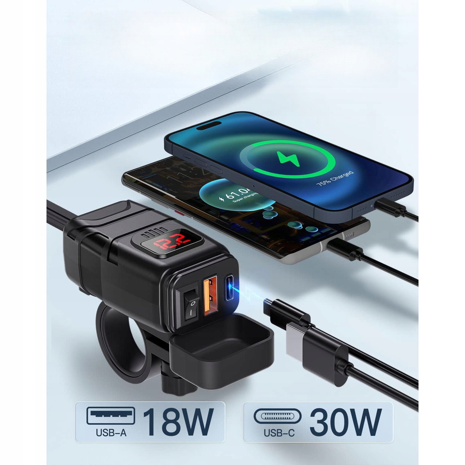 Сучасний USB-зарядний пристрій для мотоцикла, оснащений двома портами - USB-C (PD 30 Вт) і USB-A (Quick Charge 3.0 18 Вт). Він дозволяє заряджати два пристрої одночасно та може зарядити ваш телефон до 50% всього за 30 хвилин!