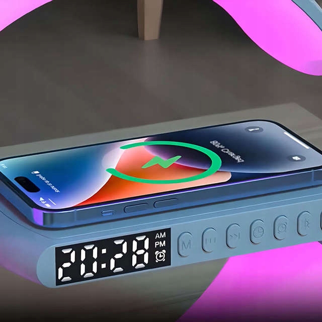 - Продукт: Інтелектуальна світлодіодна лампа RGB з індуктивним зарядним пристроєм, годинником, будильником і динаміком