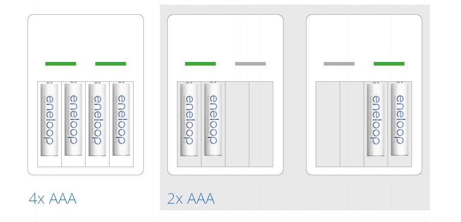 Зарядний пристрій заряджатиме як батареї AA/R6, так і менші батареї AAA/R03. Можливе завантаження в різних конфігураціях.