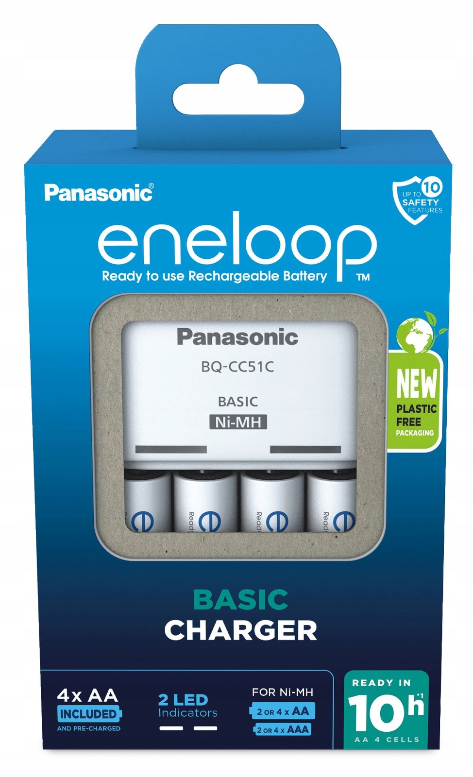 Для вашої зручності зарядний пристрій продається в комплекті з популярними акумуляторами Panasonic Eneloop R6 / AA 2000mAh Ni-MH BK- 3MCDE. Батареї можна заряджати та використовувати кілька разів, а серія Eneloop дозволяє це робити до 2100 разів! Що ще важливіше, вони зберігають до 70% своєї енергії навіть через 10 років, тому вони можуть лежати невикористаними в ящику, не побоюючись значної втрати зарядженої енергії. Вони також не мають ефекту пам'яті - їх можна зарядити в будь-який момент, не турбуючись про втрату ємності акумулятора. Eneloop такі ж прості у використанні, як і батареї, екологічні та економічні, як акумуляторні батареї.