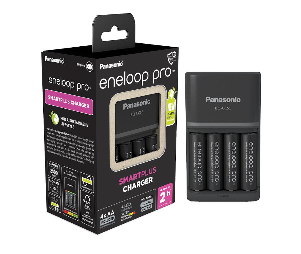 - У набір входять 4 батареї Panasonic Eneloop PRO R6/AA 2550mAh Ni-MH BK-3HCDE / 4BE