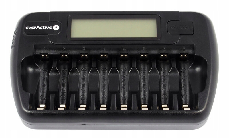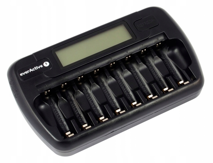 EVERACTIVE NC 800 має 8 незалежних зарядних каналів для нікель-металгідридних акумуляторів розмірів R6/AA або R03/AAA, кожен елемент заряджається окремо.