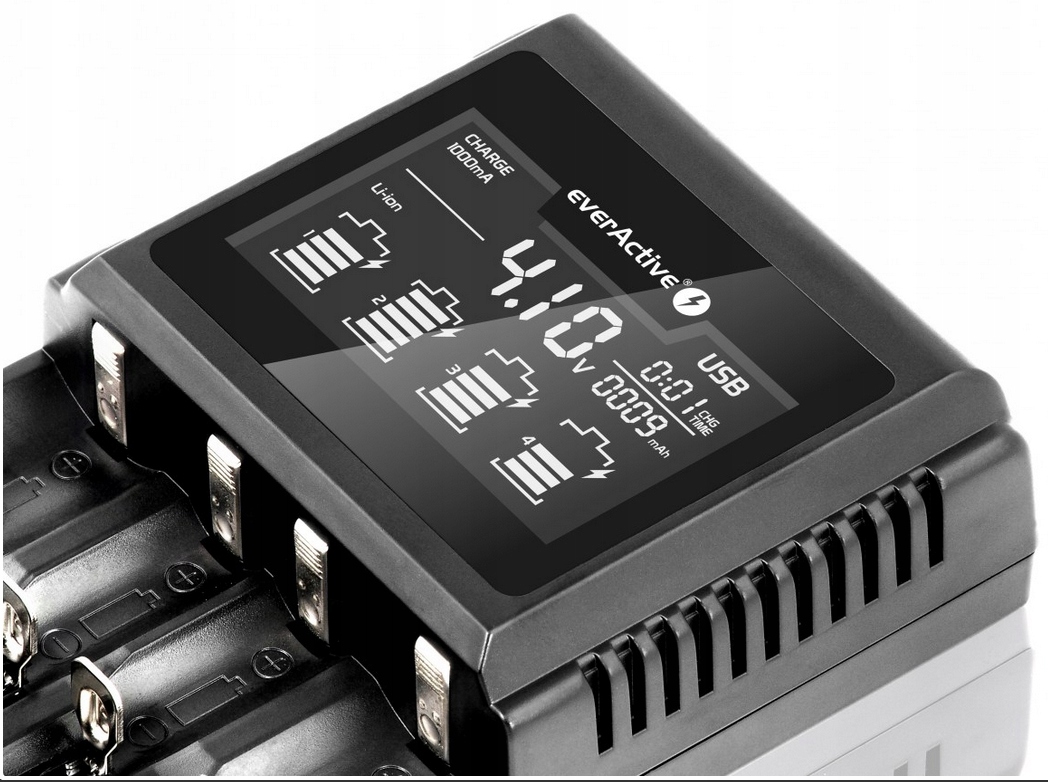 Зарядний пристрій дозволяє заряджати та тестувати 1–4 літій-іонні, літій-залізо-фосфатні та нікель-метал-гідридні батареї різних розмірів: