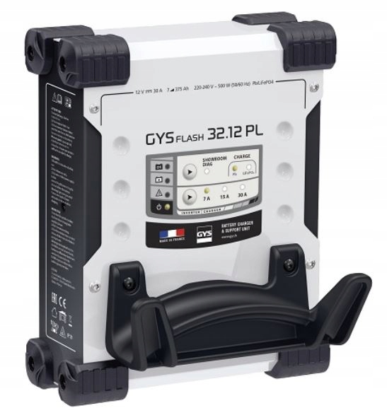 Вертикальний зарядний пристрій GYSFLASH 32.12 PL, спеціально розроблений для встановлення на стіні чи ліфті, є багатофункціональним зарядним пристроєм на 30 А для свинцево-кислотних і літій-залізо-фосфатних (LiFePO4) акумуляторів на 12 В. Його режим Showroom/Diag дозволяє доставляти транспортні засоби в автосалони або під час етапу діагностики в повній безпеці. Це також гарантує оптимальну якість зарядки для обслуговування найсучасніших автомобілів