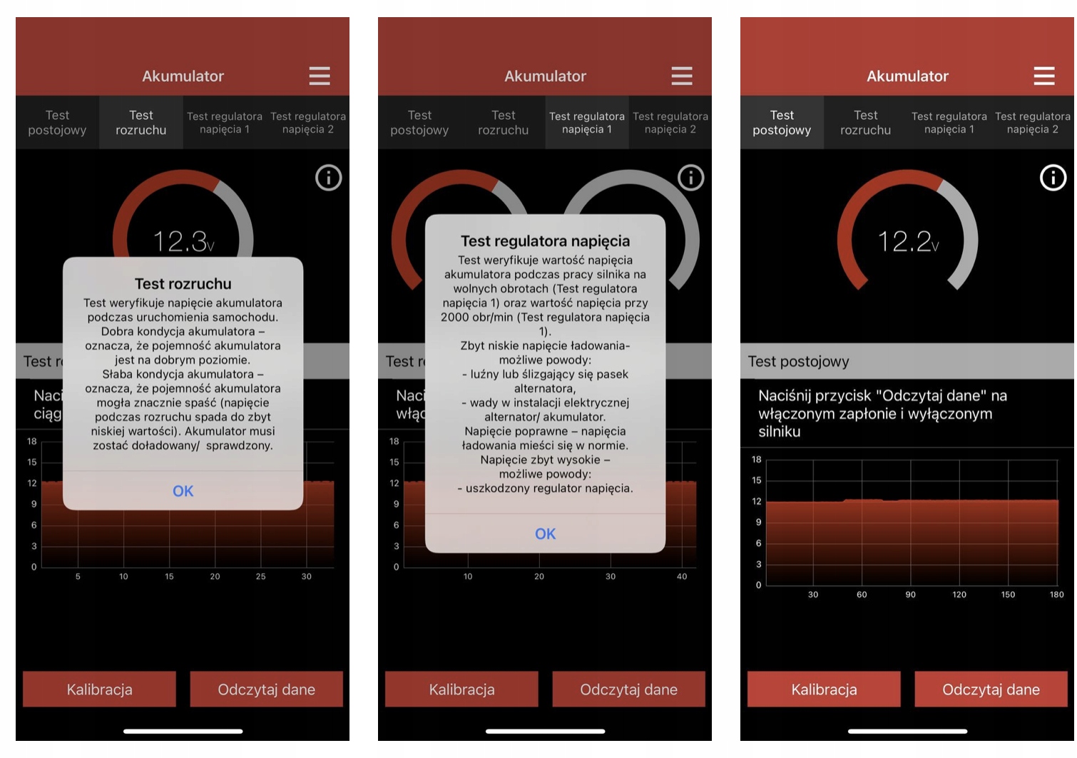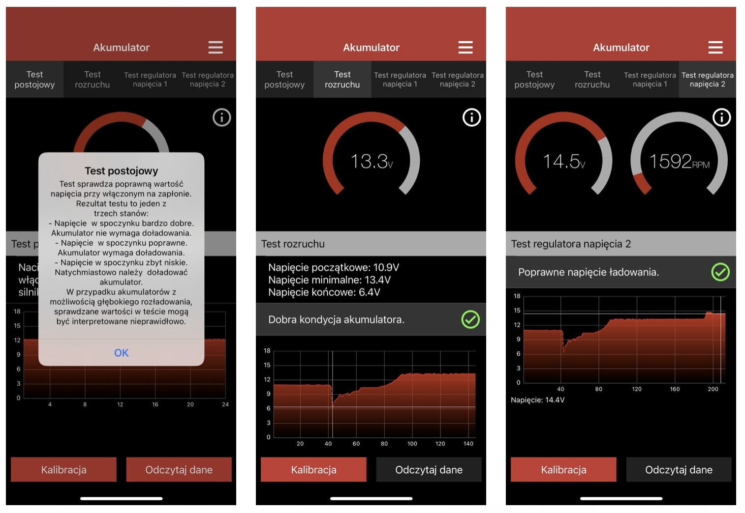 Тест дозволяє зчитувати напругу на батареї в різних режимах роботи автомобіля: