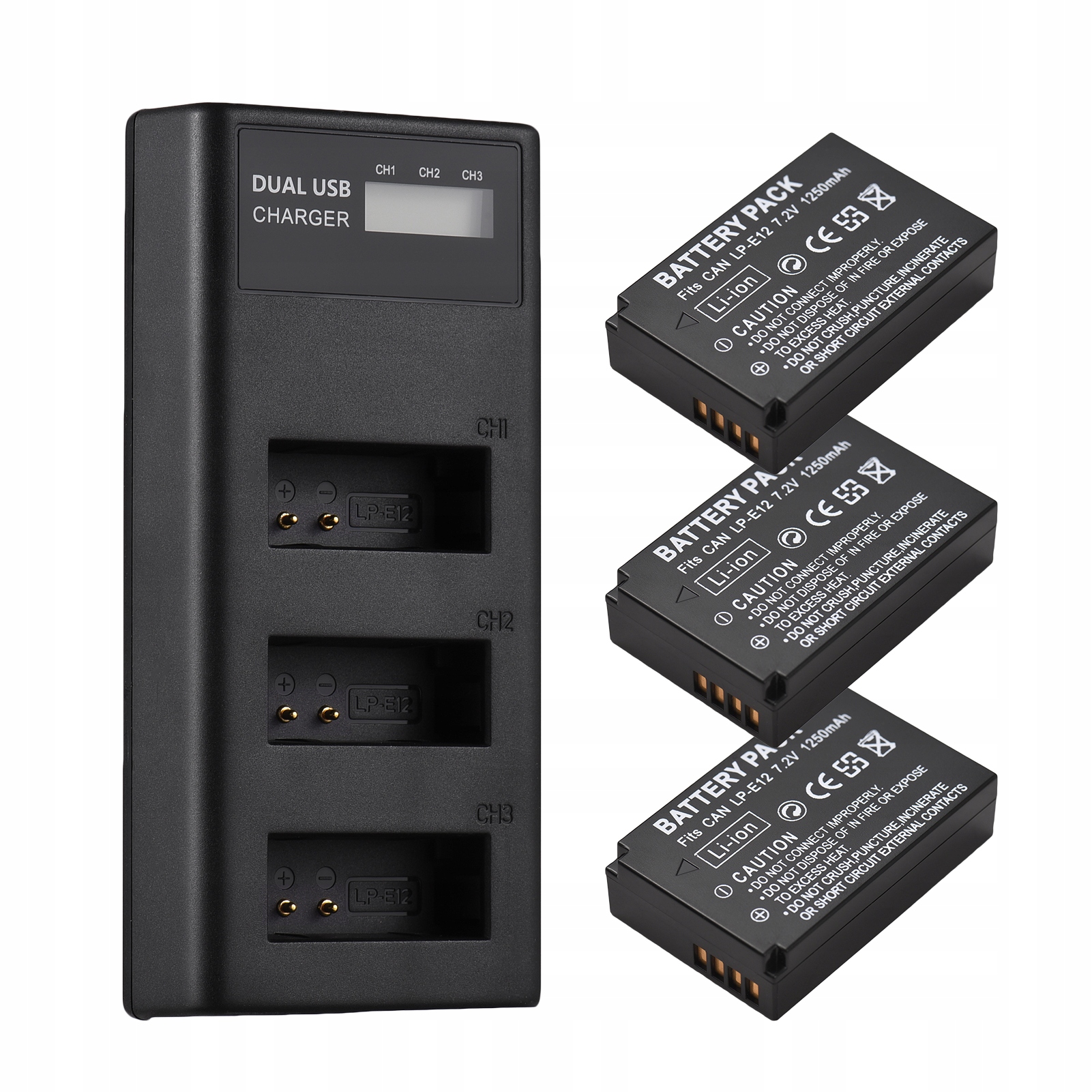 Цей комплект зарядного пристрою включає 3-канальний зарядний пристрій LP-E12 і три батареї LP-E12.