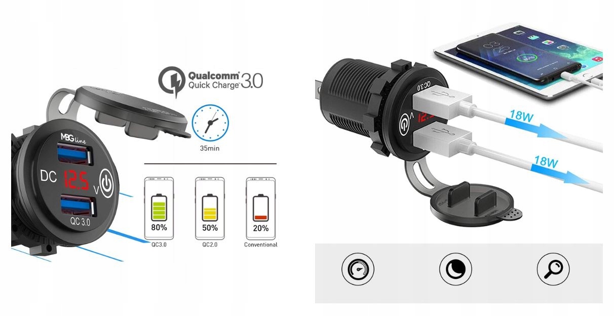 Заряджайте телефон, смартфон та інші пристрої швидше завдяки зарядці QC 3.0. Зарядний пристрій призначений як для автомобілів 12V, так і 24V. Незамінний зарядний пристрій 2 в 1 для мотоцикла, легкового автомобіля, фургона, скутера, квадроцикла, човен . Джерело живлення розроблено для роботи в несприятливих погодних умовах - просто закрийте гумову кришку.