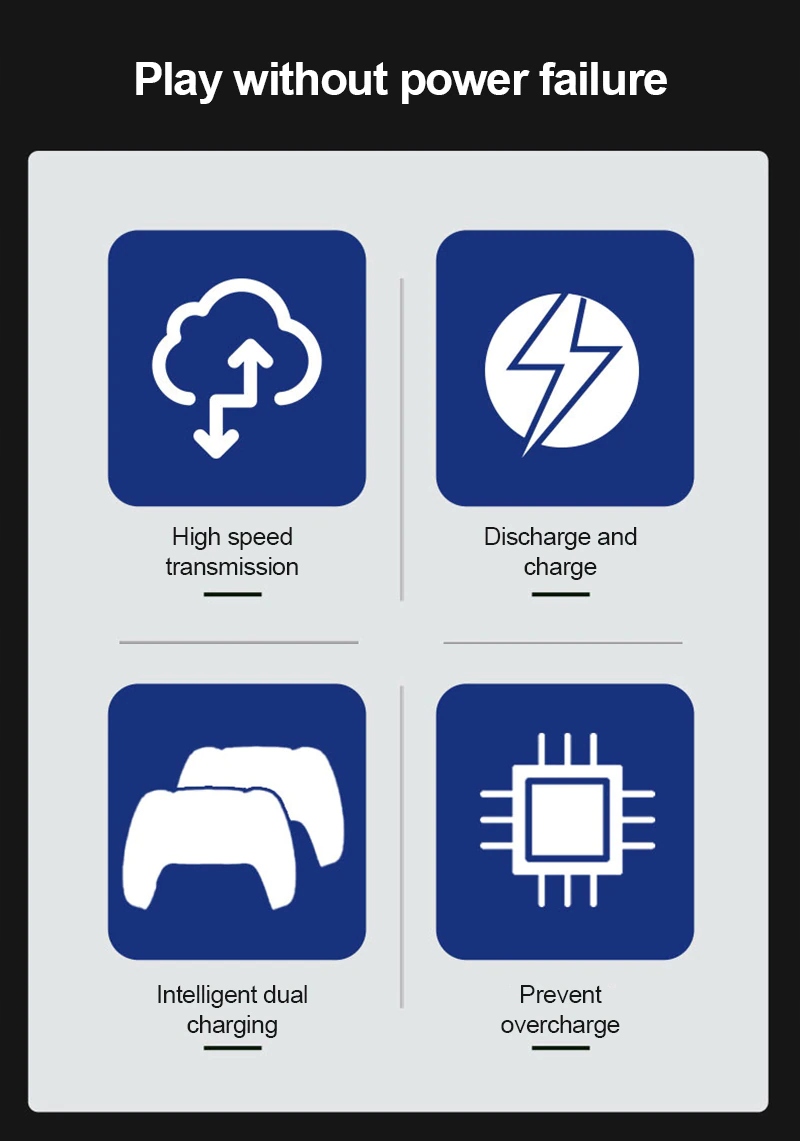 Вам більше ніколи не доведеться переривати розваги через неробочий планшет! Док-станція, спеціально розроблена для нового контролера DualSesne для PS5. Тепер ви можете швидко заряджати 2 планшети одночасно. Завдяки станції ви завжди будете готові до несподіваних візитів друзів! Ваші планшети завжди будуть повністю заряджені, тож ви зможете насолоджуватися грою безперервно!