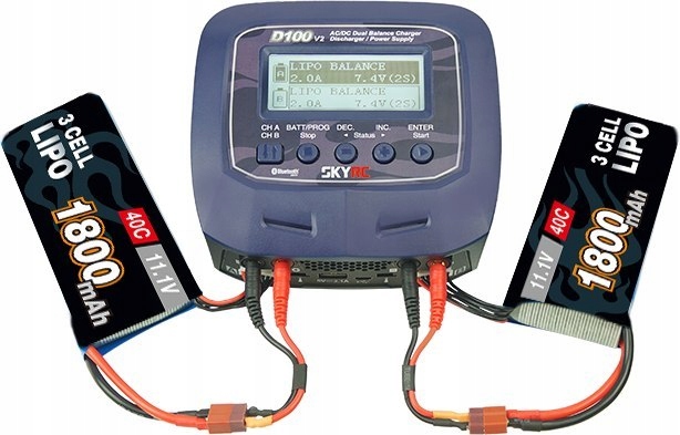 Зарядний пристрій SkyRC D100 v2 є надзвичайно інтелектуальним зарядним пристроєм. що дозволяє заряджати дві різні батареї одночасно. У режимі змінного струму можна розділити струм, наприклад, ми можемо встановити потужність 70 Вт для каналу А і 30 Вт для каналу B, що дасть загальну потужність 100 Вт. Режим постійного струму дозволяє живити різні пристрої з 13,8 В.