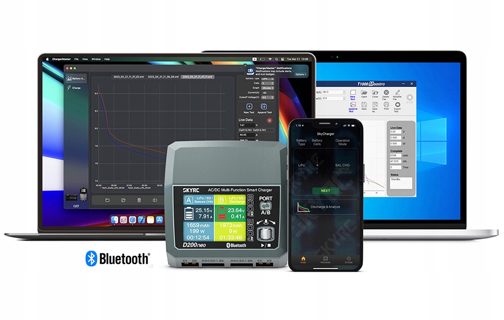 SkyRC має вбудований дисплей з інтерфейсом ColorX, який робить представлену інформацію барвистою, що значно полегшує використання пристрою. Під час роботи з BD350 зарядний пристрій D200neo може використовувати налаштований SkyRC Charger Master, що дозволяє відображати або експортувати криву розряду акумулятора в реальному часі. Це дає змогу порівнювати та аналізувати криві розряду різних батарей, що дозволяє точно виявляти пошкоджені батареї. ПРИМІТКА. BD350 і SkyRC Charger Master не включені.