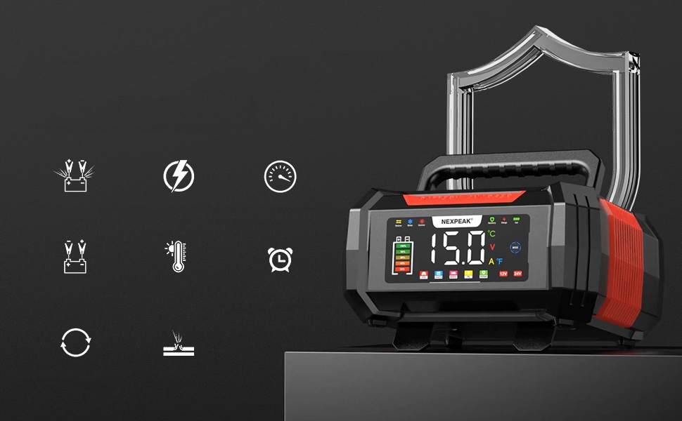12 В 15 А та 24 В 8 А, 9-ступінчастий швидкий зарядний пристрій, набагато швидше, ніж автоматичні зарядні пристрої 10 А або 8 А. Заряджає або регенерує всі свинцево-кислотні батареї 12 В і 24 В, у тому числі автомобільні, морські батареї та батареї глибокого циклу, такі як AGM, GEL, SLA, мокрі батареї в автомобілях, вантажівках, позашляховиках, мотоциклах, газонокосарках, човнах тощо. У разі проблем з якістю доступна заміна на новий продукт.
