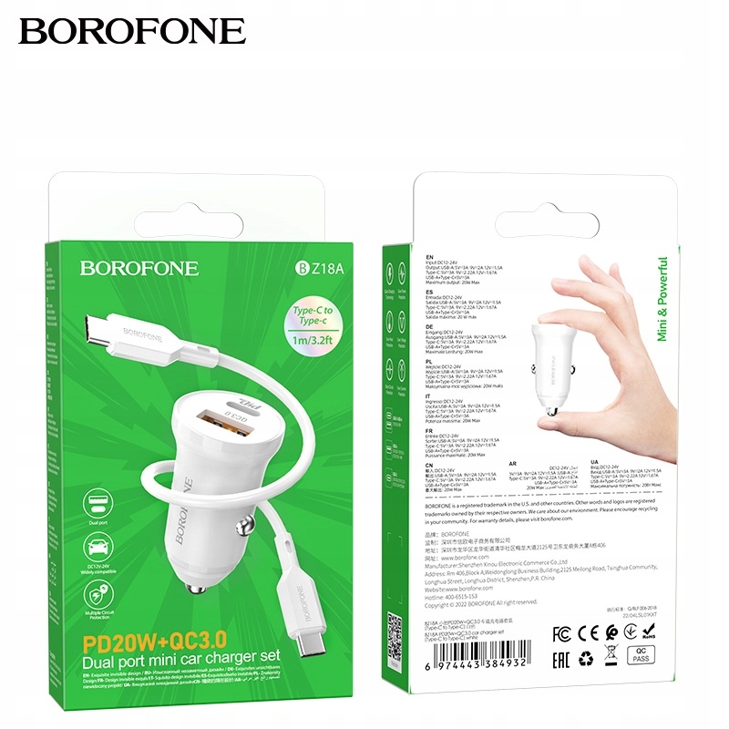 BOROFONE BZ18A до швидкий автомобільний зарядний пристрій з одним портом USB Type-C / Type C, вихідною потужністю 20 Вт, у стандарті Power Delivery / PD і другим портом у стандарті USB-A з вихідною потужністю 18 Вт у Quick Charge 3.0 / Стандарт QC3.0. Мінімалістичний дизайн, широкий діапазон напруги і широкі можливості зарядки різних мобільних пристроїв - його головні і незаперечні переваги. Зарядний пристрій сумісний з пристроями Apple і Samsung, а також іншими з роз’ємом USB Type-C / Type C. У комплект входить кабель USB Power Delivery / PD Type-C з двома роз’ємами USB Type-C.