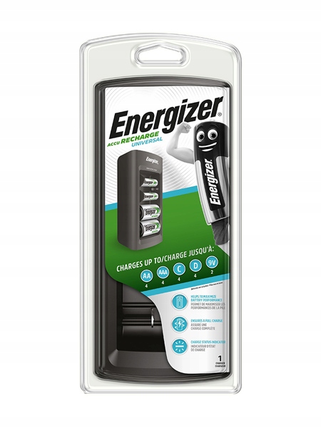 Зарядний пристрій Energizer Universal має незалежні канали зарядки, що дозволяє заряджати акумулятори AA, AAA, C, D від різної ємності, або одна-дві 9Vбатареї. Зарядний пристрій Energizer заряджає акумулятори AA, AAA, C, D, 9V і є ідеальним рішенням для всіх повсякденних пристроїв. Він пропонує чудове співвідношення ціни та якості, не займає багато місця та забезпечує повністю заряджені батареї, коли вони вам потрібні.