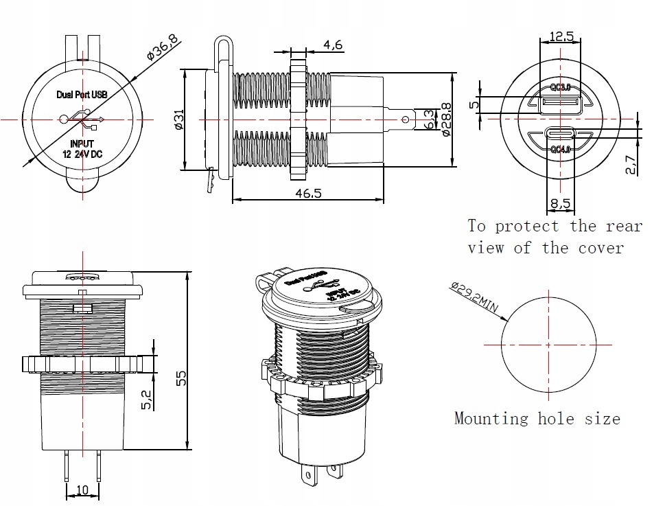 - розміри: діаметр: 36 мм, довжина: 55 мм