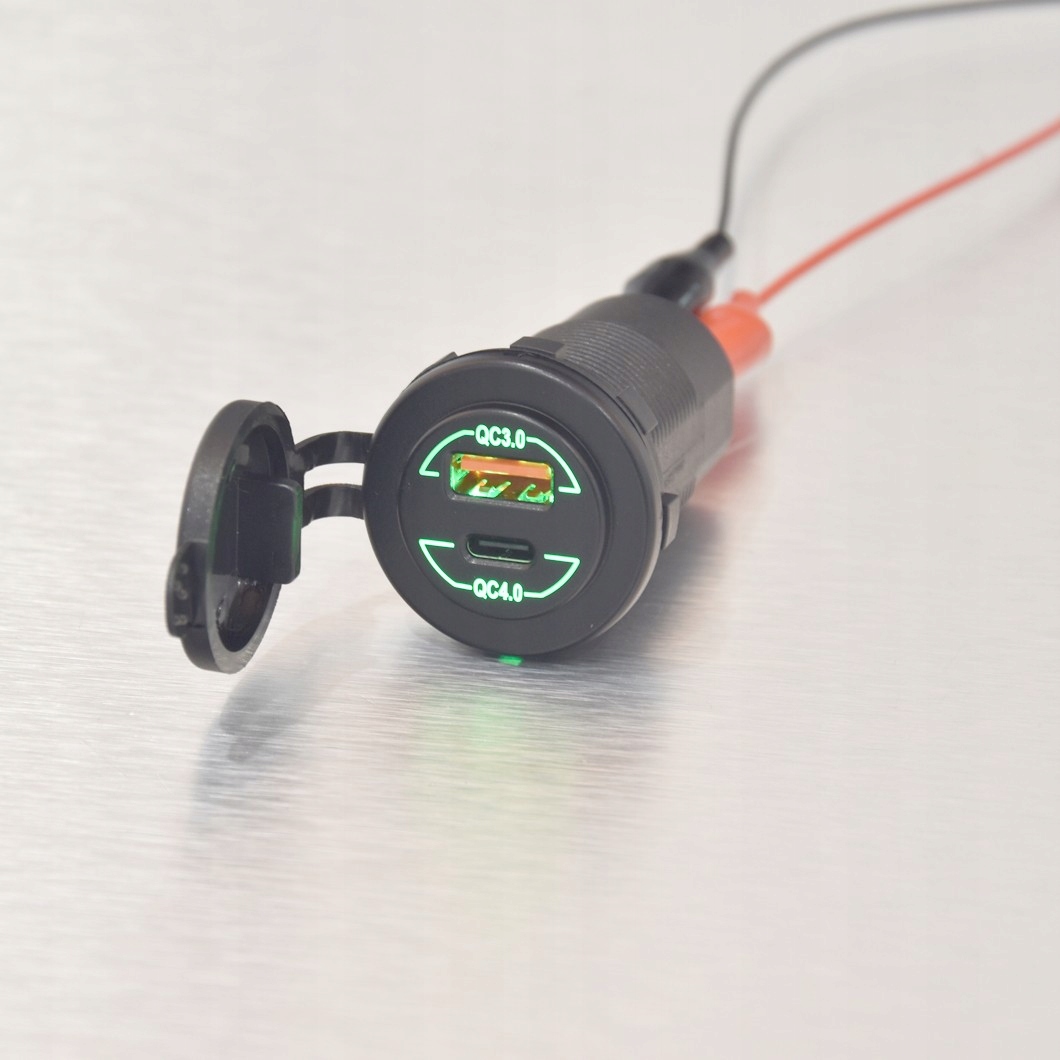 Універсальний надшвидкий зарядний пристрій для автомобіля або мотоцикла з технологією QuickCharge 4.0 і QuickCharge 3.0, встановлений у місце гнізда прикурювача.