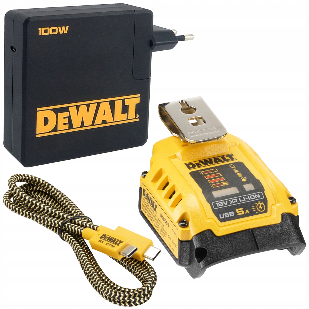 Адаптер DeWALT DCB094 використовується для зарядки/живлення акумуляторів. Він перетворює будь-яку Li-Ion 18 XR, Powerstack і FlexVolt батарею в портативний зарядний пристрій/банк живлення з USB-портом, який дозволяє заряджати широкий спектр електронних пристроїв, наприклад, телефон, планшет, ноутбук тощо яскравий і добре видимий індикатор рівня заряду батареї. У комплект входить багатовольтний блок живлення для зарядки акумуляторів через адаптер і мобільні пристрої. Блок живлення автоматично підлаштовує напругу та інтенсивність заряду під тип пристрою. У набір входить двосторонній USB-кабель типу C, призначений для швидкого заряджання (100 Вт).