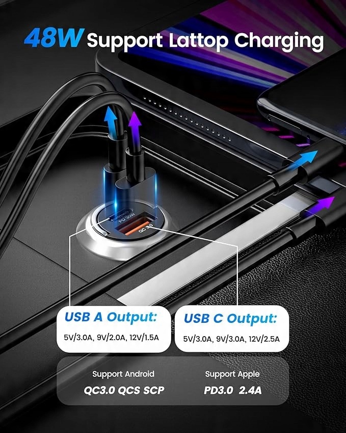 - 【PD30W+ QC3.0】 Подвійний USB-зарядний пристрій для автомобільного прикурювача включає порти USB-C і USB-A. Завдяки технології швидкої зарядки PD3.0 і QC3.0 вихідна потужність може досягати 30 Вт, коли використовується лише один порт. Водночас цей подвійний автомобільний зарядний пристрій підтримує заряджання двох пристроїв одночасно та автоматично адаптується до кожного порту. Процес заряджання в 5 разів швидший, ніж звичайне заряджання.