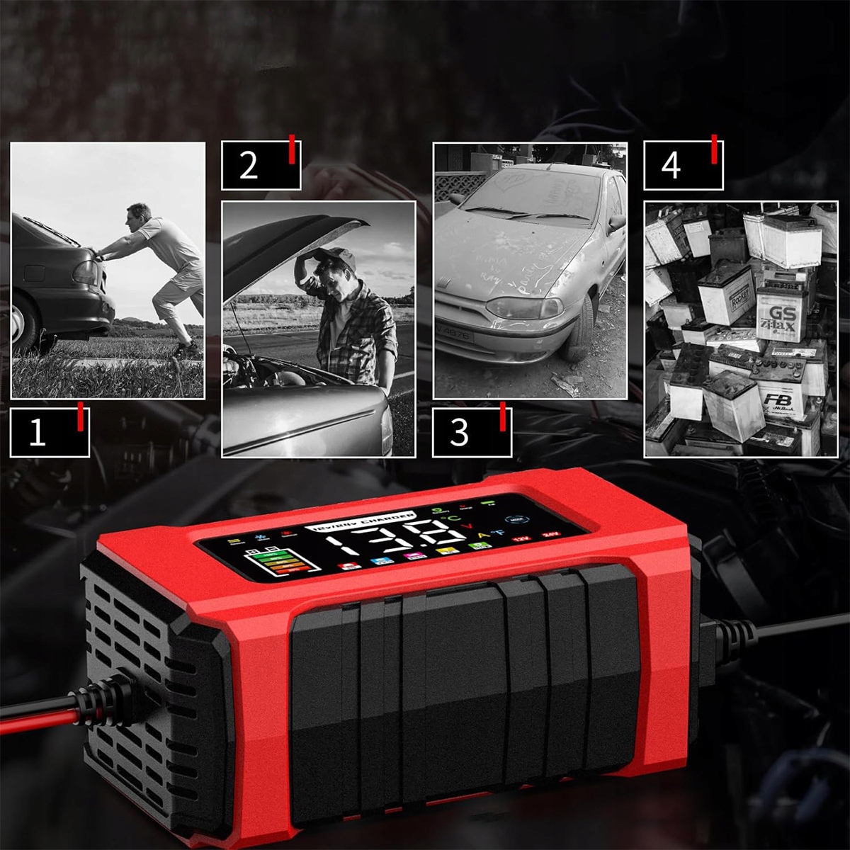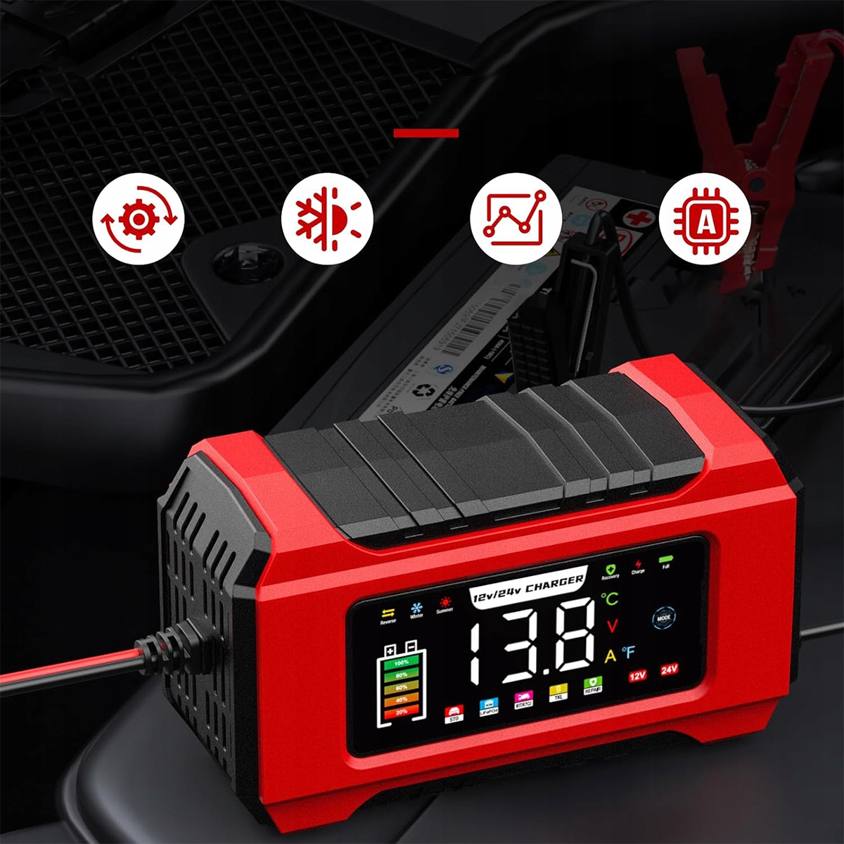 Вбудована функція десульфатації та регенерації для подовження терміну служби акумулятора. Спеціальна функція для ремонту сильно розряджених акумуляторів (від 0,3 В). Автоматичний режим обслуговування для безпечної тривалої зарядки. Ідеально підходить для автомобілів, вантажівок, мотоциклів, човнів і кемперів.