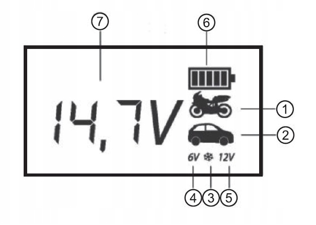 Гелеві акумулятори ємністю до 14 А·год, які використовуються в мотоциклах і скутерах, слід заряджати, вибравши програму із значком мотоцикла на дисплеї.