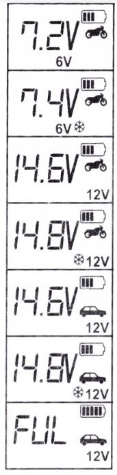- Стадія 9 - Відновлення: випрямляч автоматично визначає, що акумулятор повністю заряджено, що позначається словом FULL на дисплеї з’являється FULL;
