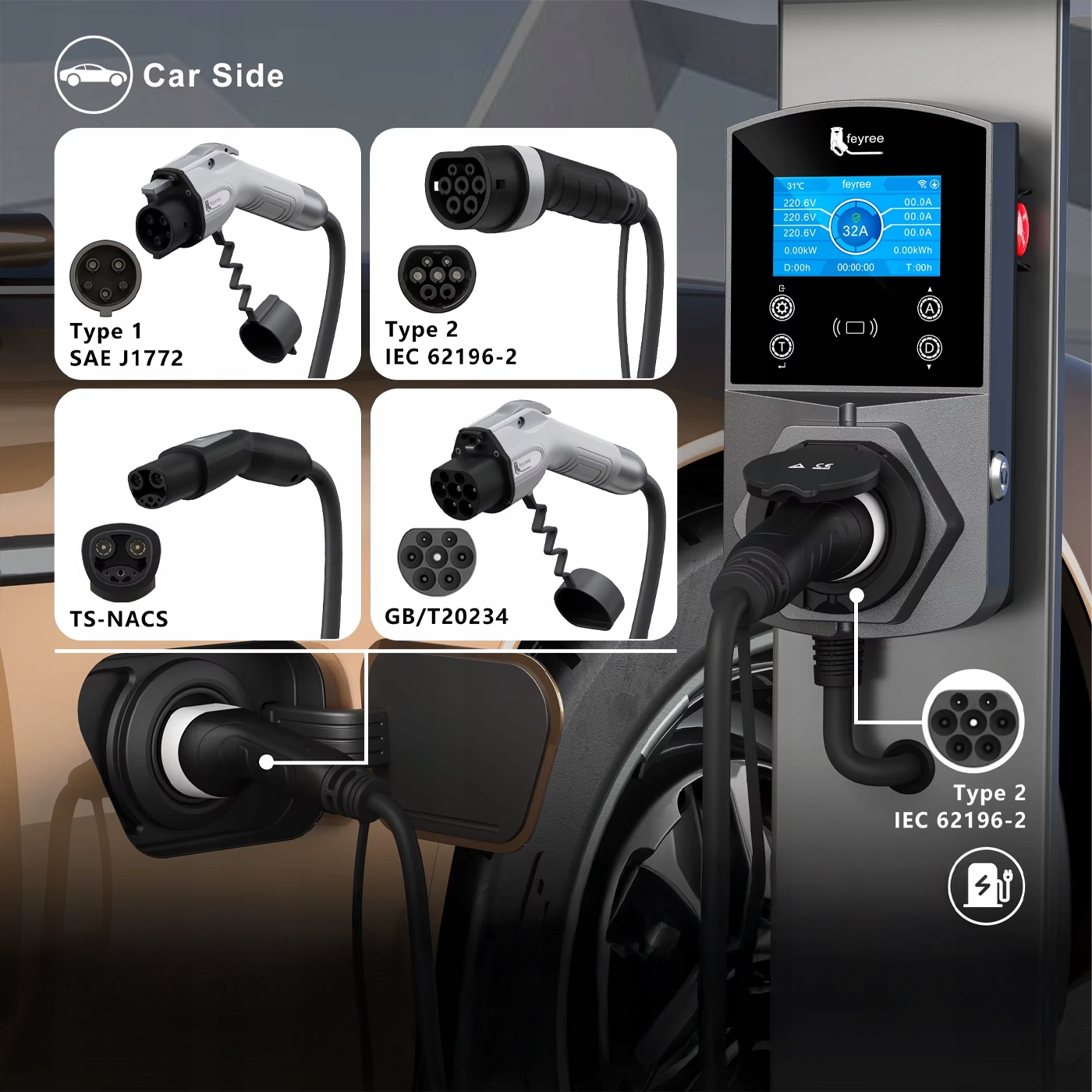 - ❌ Тип розетки: версія розетки типу 2 (сумісна з кабелями типу 1, GB/T, TS-NACS за допомогою адаптера або відповідного кабелю).