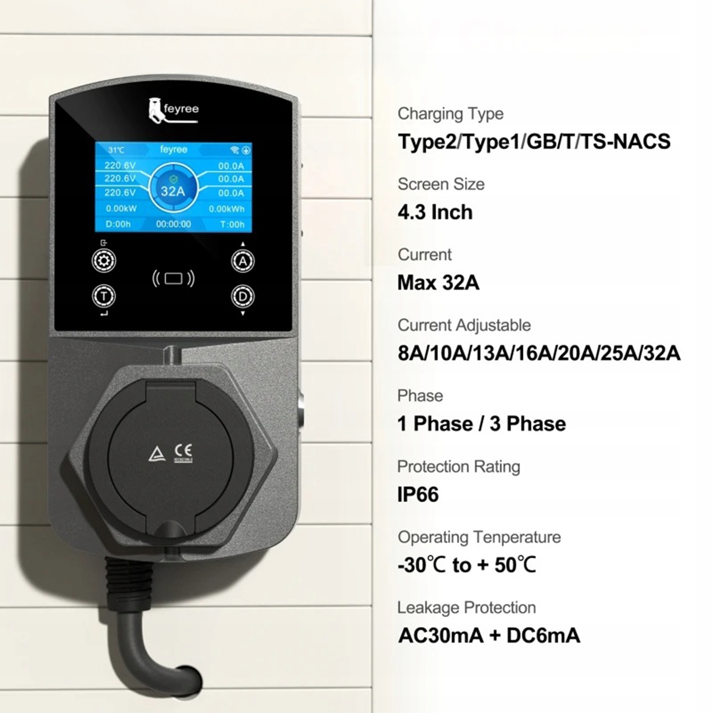 - ❌ Регульований струм: Струм заряджання можна регулювати в діапазоні: 8A, 10A, 13A, 16A, 20A, 25A, 32A.