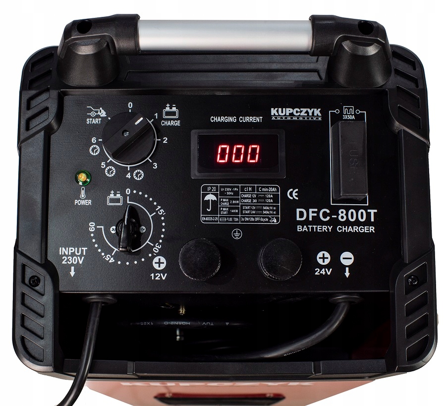 Зарядний пристрій Kupczyk DFC-800T розроблений для зарядки свинцево-кислотних акумуляторів струмом 12В або 24В. і для запуску легкових автомобілів, мікроавтобусів, автобусів з бензиновими і дизельними двигунами, невеликих вантажівок і легкої будівельної техніки. Прилад оснащений інтуїтивно зрозумілою панеллю управління з практичним електронним дисплеєм. На панелі є зручні перемикачі: 12В/24В, кнопки повільної та швидкої зарядки та кнопка запуску. Крім того, випрямляч має запобіжник, який захищає від перевантаження. Додатковими перевагами пристрою є колеса, які полегшують транспортування зарядного пристрою, і передня кишеня для приховування кабелів.