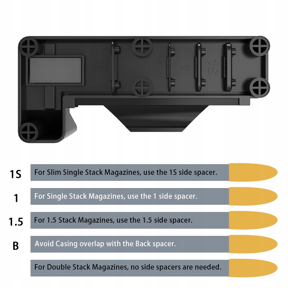 Наші читачі Fast Magazine мають порожні розпірки для одиночних журналів стека, подвійного стека, 1,5 стека та одиночної стека Slim/Steel - вони розміщуються на дні швидкого пандуса, завдяки якому вони залишаються легкодоступними та безпечними на місці, що дозволяє заряджати інші журнали.