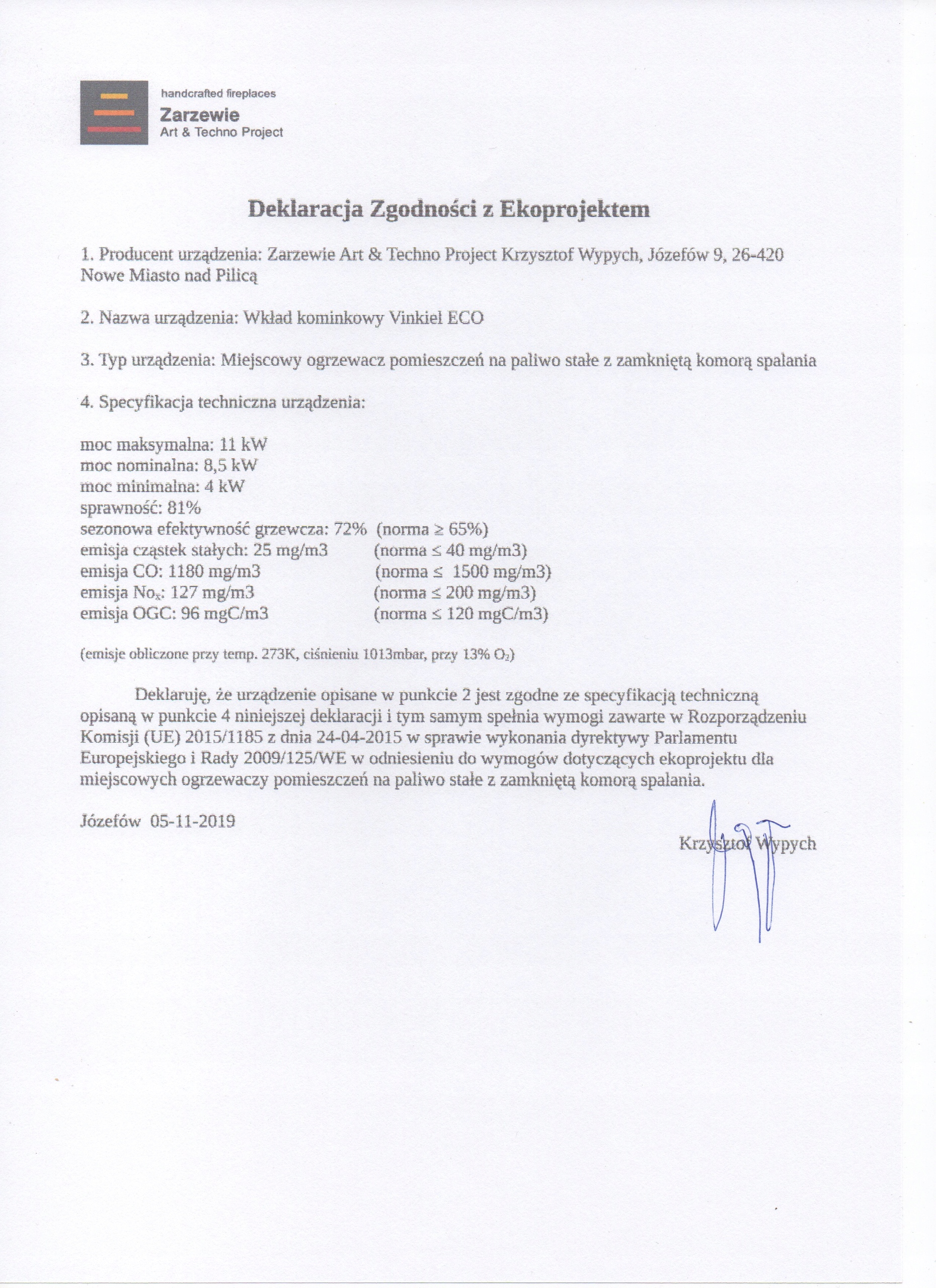 - Продукт відповідає вимогам: Регламент Комісії (ЄС) 2015/1185 від 24 квітня 2015 р. Про впровадження Європейського парламенту та Директиви Ради 2009/125/ЄС стосовно вимог до проекту для місцевого нагрівача твердого палива
