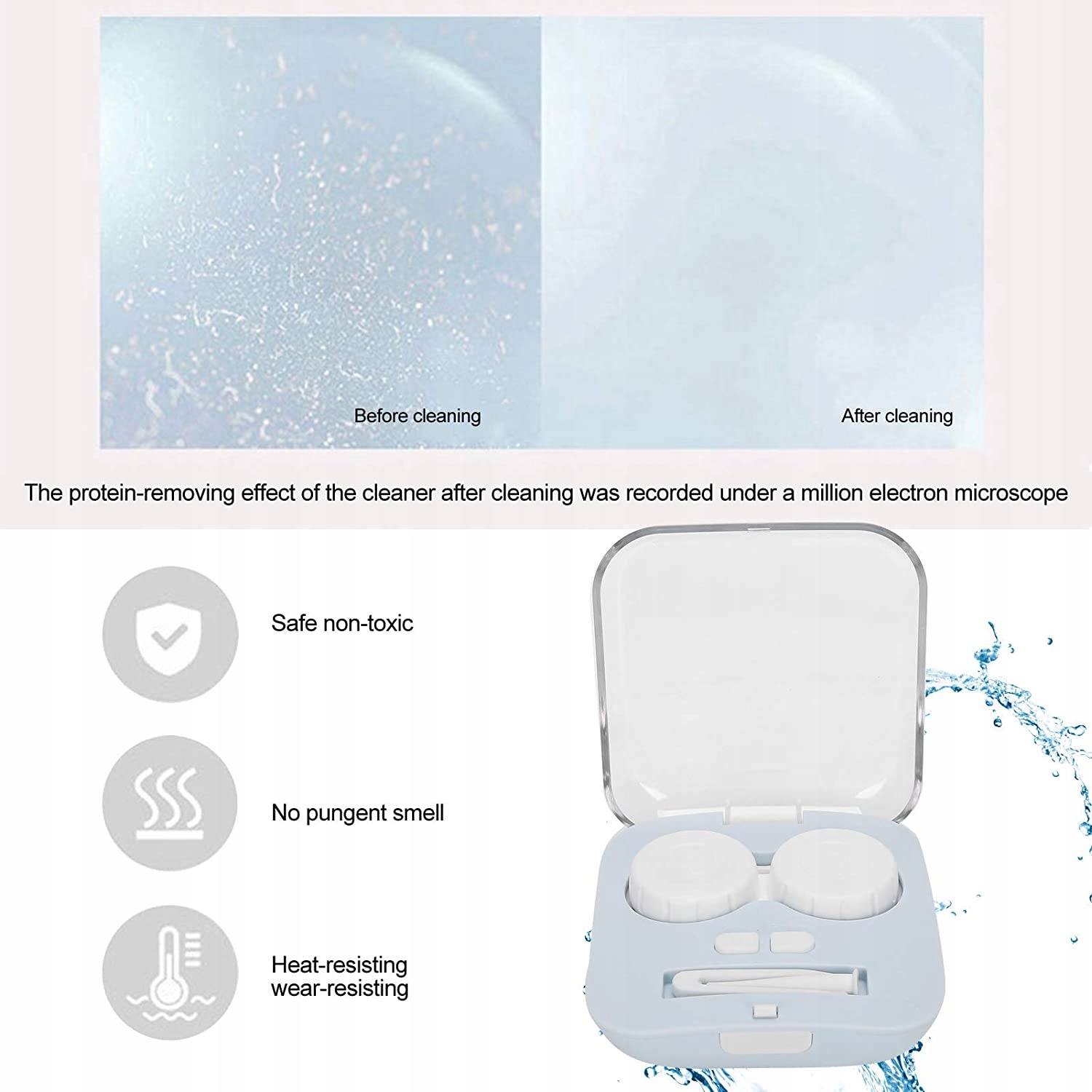 Гуманізований незалежний дизайн ящика для очищення, більш зручний для очищення та заміни самого ящика. Екологічно чистий матеріал, безпечний без різкого запаху, термо- та зносостійкий. Технологія ультразвукової пульсації може легко видалити плями та пил з контактних лінз. Інтелектуальна функція синхронізації три хвилини щоденного прибирання п’ять хвилин глибокого очищення. USB-зарядка призначена для зручного використання в різних випадках. Заряджання протягом 1 години може залишатися в режимі очікування протягом 6 місяців, використання один раз на день може тривати протягом 60 днів безперервно.