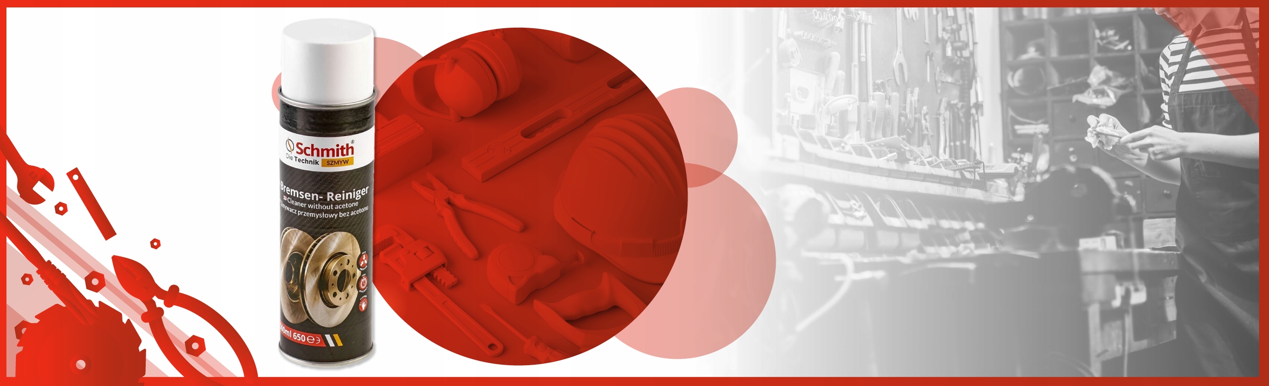 Brake cleaner від Schmithефективно очищає та знежирюєметалеві елементи від будь-яких забруднень. Повільно випаровуєтьсяі підходить для очищення поверхонь перед наклеюванням і фарбуванням. Можна використовувати для гальмівних елементів і зчеплення. Ефективно видаляє захисне покриттяз гальмівних дисків, антикорозійне покриття з форм для лиття під тиском, сажута інші стійкі забруднення (включаючи отримані від використання воску, жирів, засобів захисту від часу та клеїв). Завдяки своїм властивостям він використовується в металургійній, суднобудівній, гірничодобувній промисловості, поліграфічній промисловості, автомобільній промисловості. /b>і хімічній.