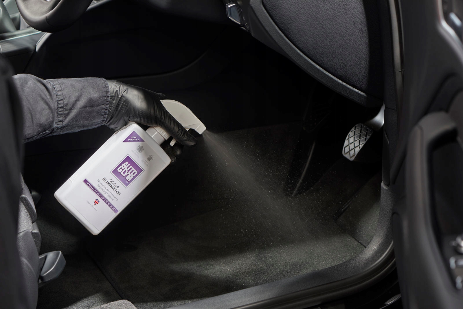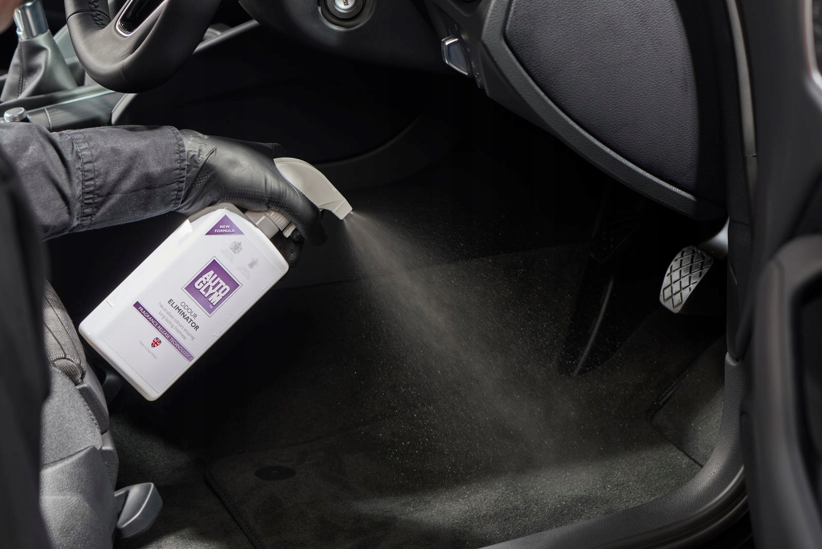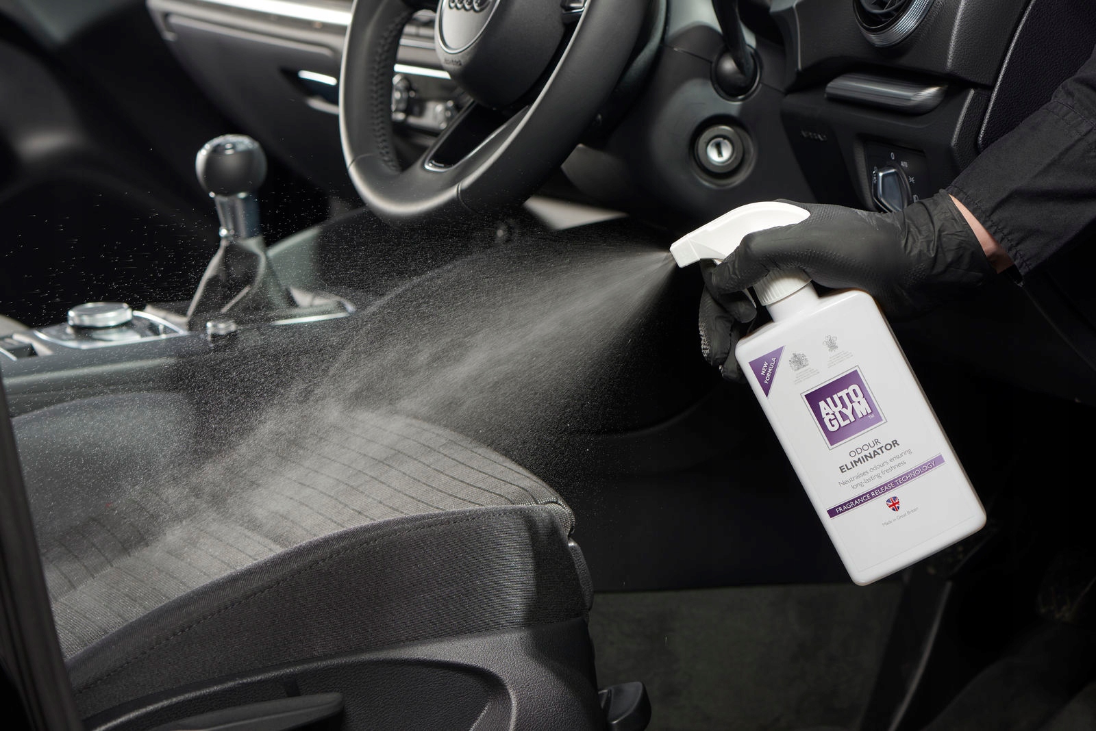 Напиліть килимки, килимки та сидіння, щоб нейтралізувати неприємні запахи. Ми завжди рекомендуємо ретельне очищення за допомогою "Interior Shampoo", щоб усунути джерела неприємних запахів, але якщо це неможливо, "Odor Eliminator" є ідеальним тимчасовим рішенням.