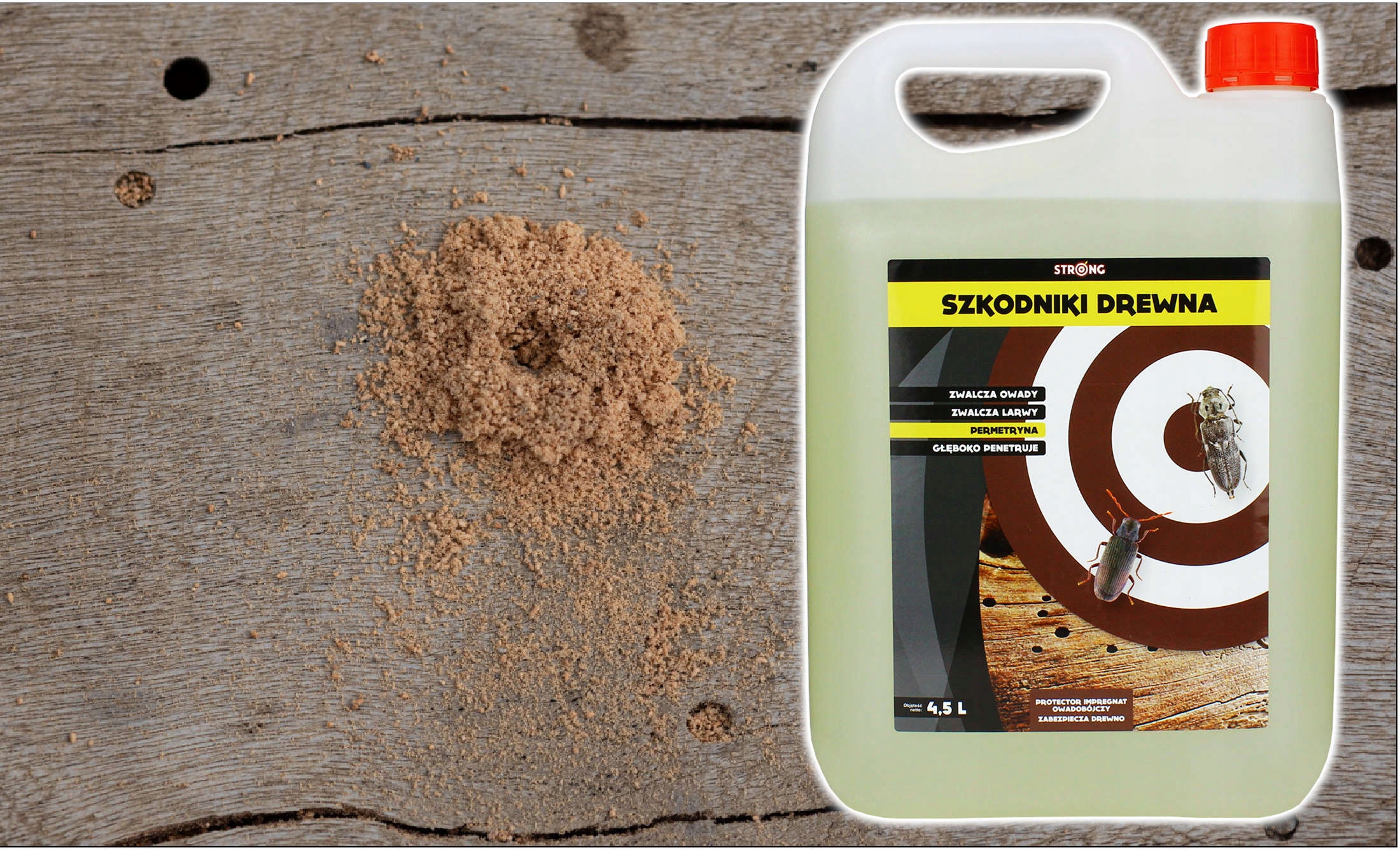 Інсектицидне просочення СИЛЬНИЙ ДЛЯ ШКІДНИКІВ ДЕРЕВИНИ - це захисний засіб нового покоління для боротьби зі шкідниками деревини. Особливо ефективний проти листових кліщів (Anobium Punctatum), листових кліщів (Hylotrupes bajulus), пульпових кліщів (Lyctus brunneus), сріблястих кліщів (Sirex gigas), термітів, короїдів та інших.